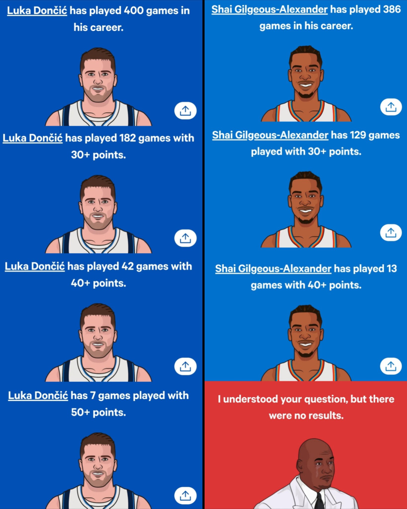 东契奇职业生涯出战400场比赛、契奇182场比赛得分30+、和亚还追42场比赛得分40+、历山7场比赛得分50+。大数的路